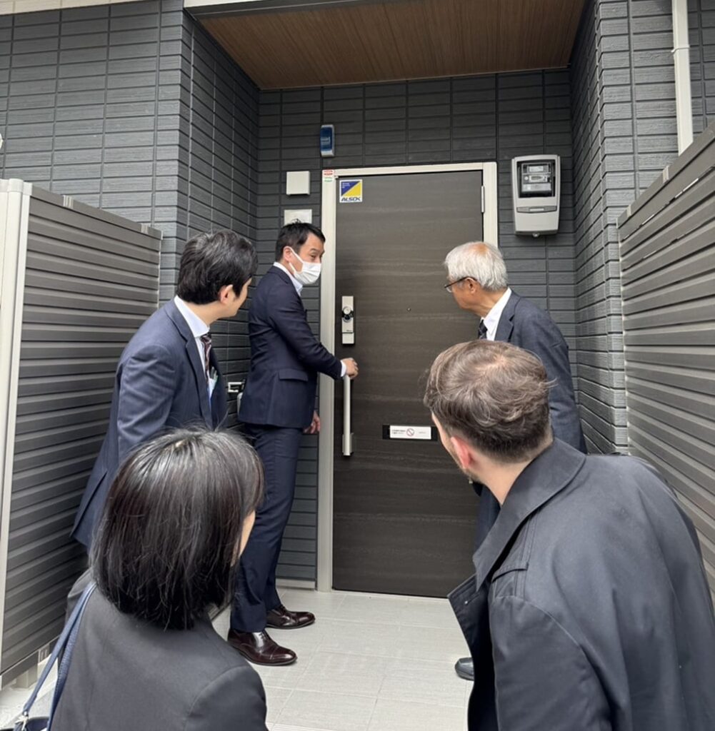 今回の見学の目的は、日本における集合住宅のセキュリティ設備の現状視察とされており、建築主の大和ハウス工業様の他、ホームセキュリティのALSOK(綜合警備保障株式会社)様と弊社が設備側の説明企業として参加させていただきました。 ちなみに今回弊社が装置を導入させていただいた本物件は、「セキュリティマンション認定(※)」を取得されています。